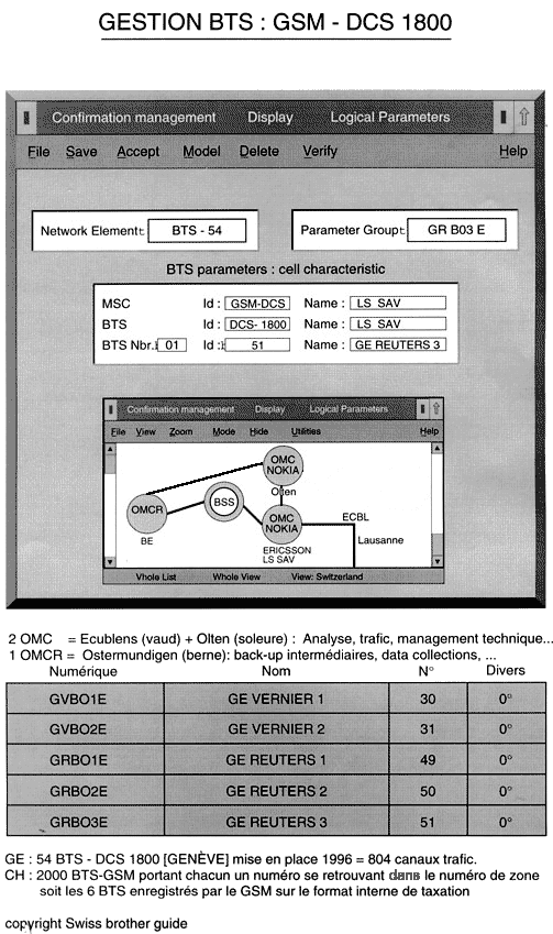 In fact, the teleoperator memorizes the tracks of a mobile phone and it can search it at anytime by consulting the protocols analysers. Every file (subscribers, EIR equipment, etc.) is registered in the MSC or the MOBILCOM central (four of them are in Switzerland, and four in Paris).